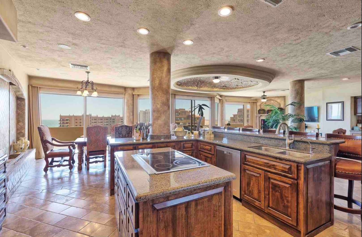 Bienvenido al condominio de 5 estrellas más nuevo y hermoso de Puerto Peñasco. ¡Esta propiedad ofrece privacidad, seguridad cerrada, ascensor privado, vistas espectaculares, una playa tranquila, hermosa piscina, jacuzzis y mucho más! Usted es tratado como la realeza como guardias de seguridad amistosos le dan la bienvenida a la península de Las Conchas y el centro vacacional de 5 estrellas de Tessoro. Tu espaciosa casa de vacaciones de 2,237 pies cuadrados incluye 3 dormitorios, 2 baños, cocina completa y un amplio comedor y sala de estar con un balcón del sexto piso.