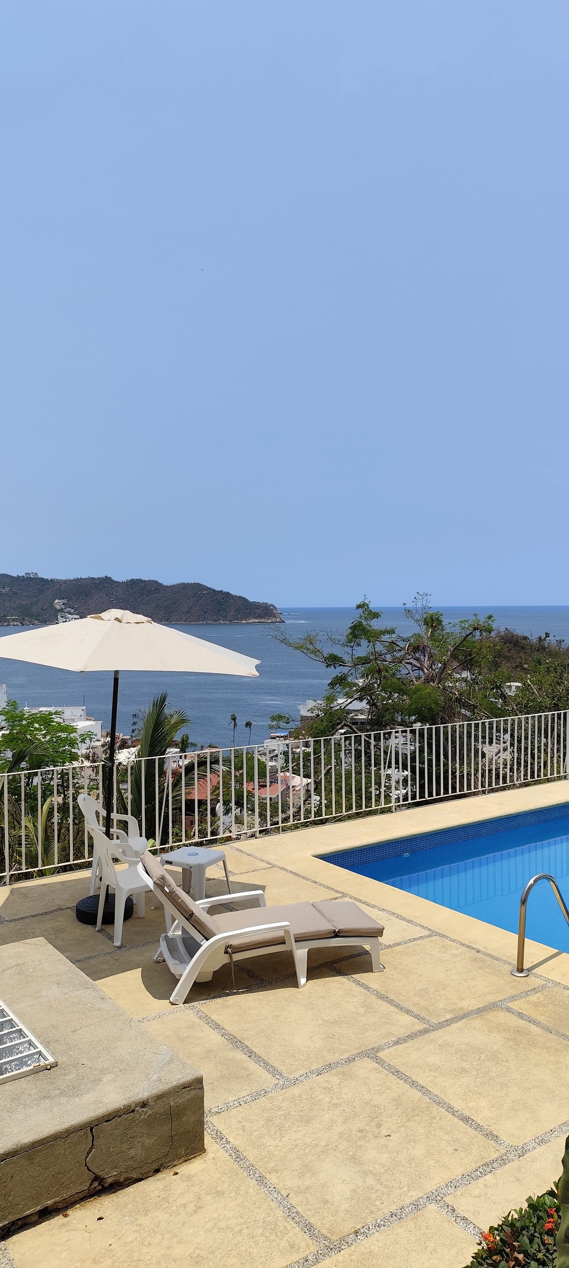 Totalmente renovada después de Otis: hermosa villa blanca en estilo relajado, de playa con detalles artesanales mexicanos. Piscina privada, 3 dormitorios con aire acondicionado, 2 estudios, sala de estar y comedor, todos con vistas completas al océano Pacífico. Llegada en auto muy recomendable, 2 lugares de estacionamiento disponibles. Casa club con una gran piscina, sauna y gimnasio. Limpieza incluida, servicio de cocina disponible a pedido. Seguridad las 24 horas. Sendero para correr/caminar disponible a través de Brisas, con vistas a la bahía de Acapulco.