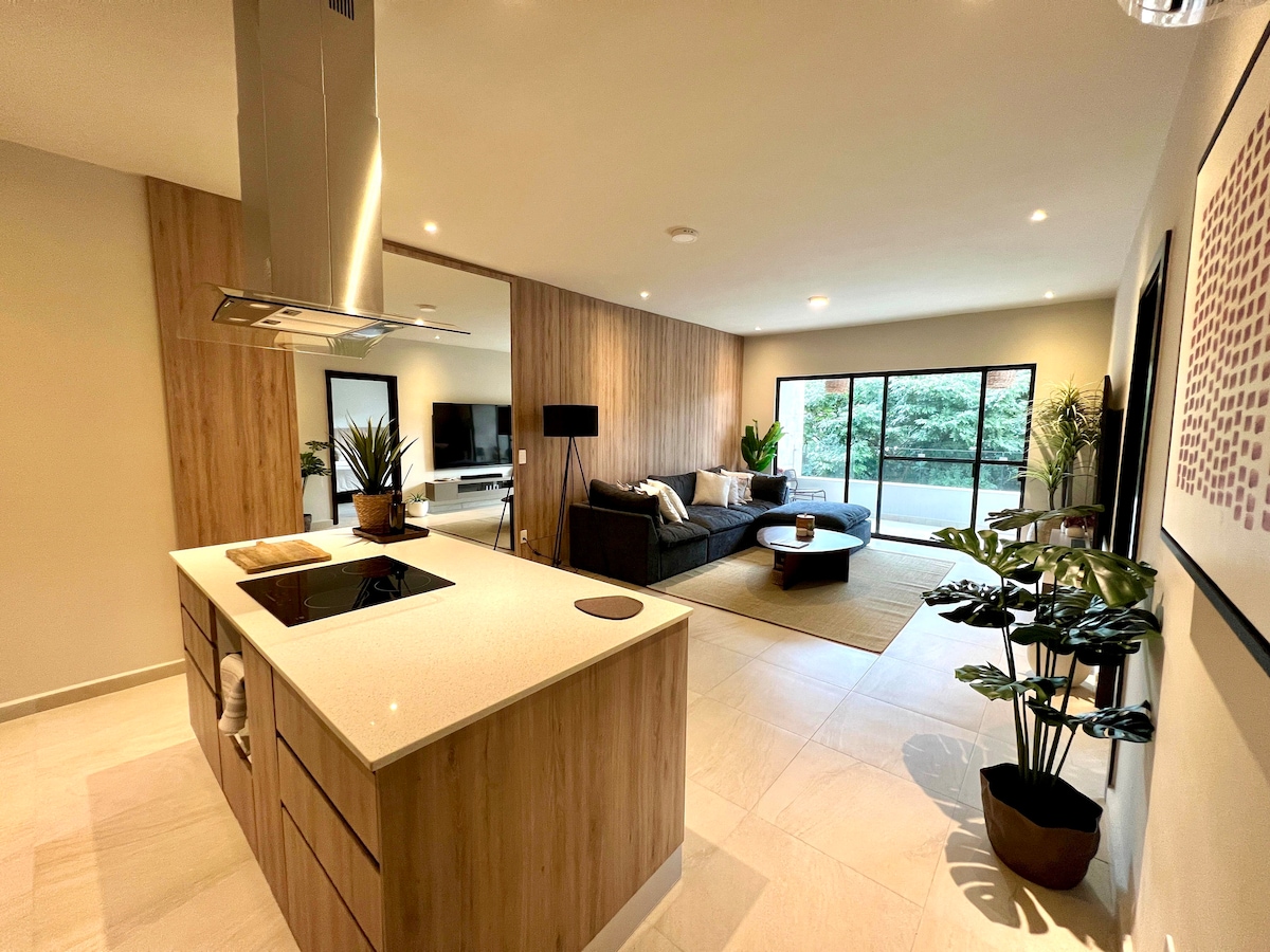 Moderno depa 1 recámara en The City Playa del Carmen. Terraza privada con vistas al jardín, sala y cocina equipada. El complejo ofrece 2 albercas con bar y restaurante, cine, gym, sauna, vapor, sala de masajes, servicio a la habitación, seguridad 24h, estacionamiento subterráneo con acceso privado al departamento y wifi en áreas comunes. A 3 cuadras de la playa y 5ta Avenida, rodeado de restaurantes y tiendas. Ideal para parejas o nómadas digitales.