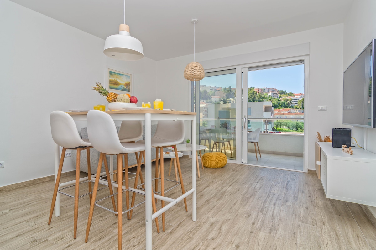 Hermoso departamento con una vista increíble sobre el mar, las montañas y la ciudad. Cerca de Split y a pocos minutos a pie de las playas. Espacioso, tiene: 2 dormitorios, 2 baños, una sala de estar, una cocina y una gran terraza privada y2 balcones. Totalmente equipado, nueva climatización, wifi de 300 Mbps, televisor inteligente, estacionamiento privado gratuito. Se adapta de 2 a 6 personas. Justo al final de nuestra carretera (300 m,~5 minutos a pie) hay varias playas, supermercados, restaurantes, cafeterías y bares, y una parada de autobús que conecta directamente el antiguo centro de Split con nuestro vecindario.