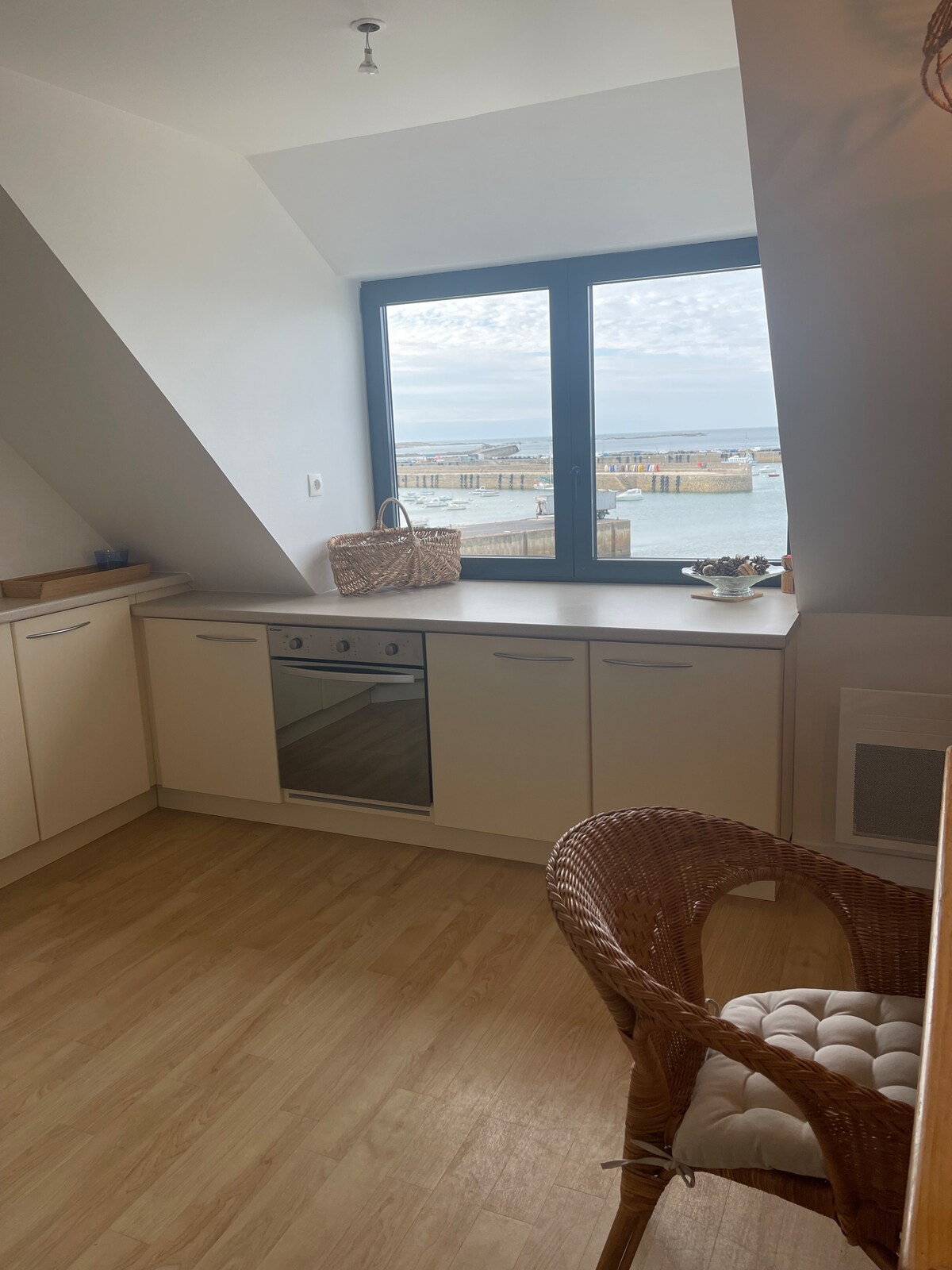 Apartamento abuhardillado muy luminoso y espacioso, que le ofrece dos dormitorios, uno con cama doble y el otro con dos camas individuales o una cama convertible de dos plazas. Desayuno con vistas al mar desde la cocina. Esquina de escritorio (si no se puede olvidar en absoluto). ¡WiFi, TV, reproductor de DVD y biblioteca, pero nunca llueve en Bretaña!