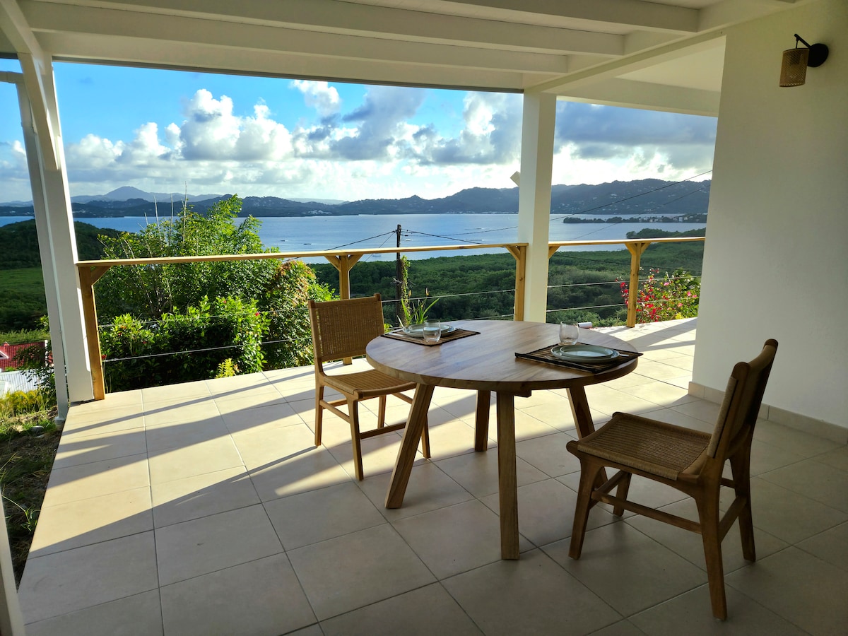 Charmant duplex, coloré et très fonctionnel, avec une terrasse avant en ré de jardin et vue imprenable sur la baie et les îlets du François et terrasse arrière avec une vue campagne. Logement compatible pour 2 adultes ou 2 adultes/2 enfants en raison de la configuration de la chambre.
