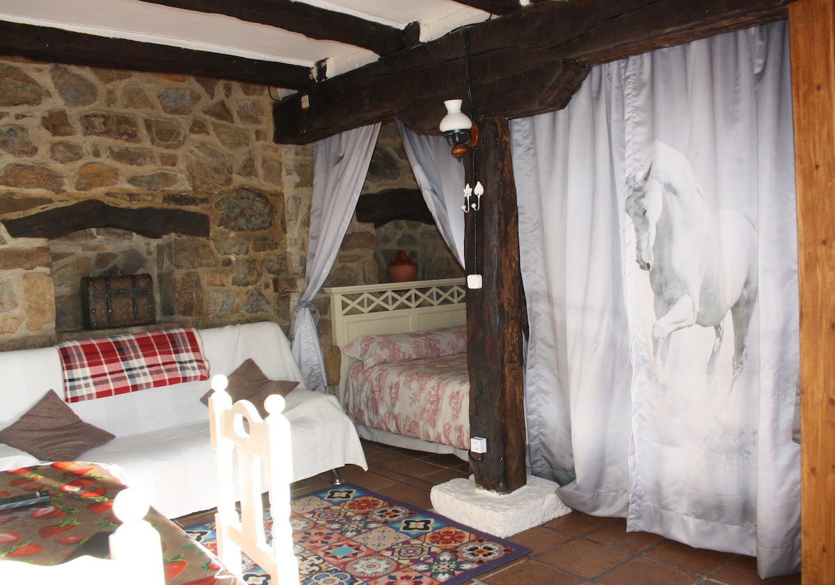 Uno de los lugares mas deconocidos de España , guarda paisajes maravillos , rincones de cuento .. ideal para romanticos , amantes de la naturaleza y bucolicos soñadores . La casita de 50 metros cuadrados esta en la planta de un edificio con dos puertas independientes en la fachada . Una de ellas es la de la casita y la otra da a una casa de 5 habitaciones donde se alojan mas viajeros . En el porche teneis una mesa de picnic para vuestro uso exclusivo .