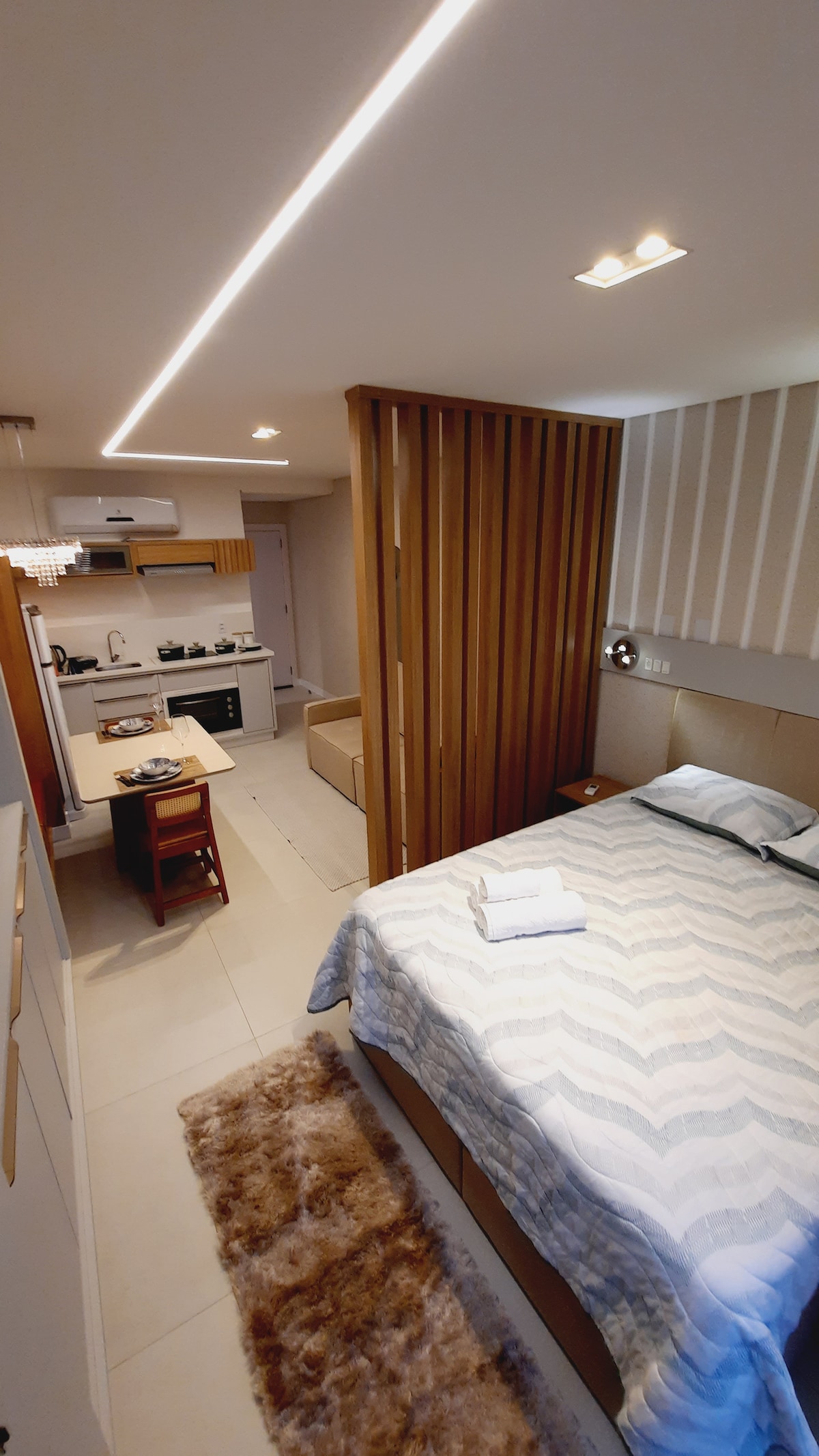 Apartamento de lujo de 69m2 para uno o dos. Tiene: -Una habitación completa con cama tamaño king. • Ropa de cama TRUSSARDI y toallas de baño. • Aire acondicionado de 18 000 BTU en el dormitorio (solo frío). • Cocina completa con refrigerador, microondas, encimera de cinco quemadores, mesa de comedor de cinco asientos. • Artículos de cocina completos • Sofá retráctil. • TV de 65 pulgadas con SMART TV. - Baño completo. • WIFI de 250 Mbps • Lavadora y secadora Samsung ¡Atención! Todos los enchufes son de 220v.