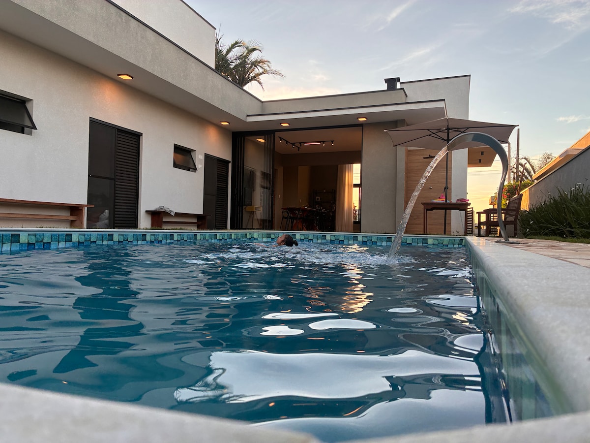 Ven a disfrutar y recargar energías relajándote con toda tu familia en este espacio con amplio alojamiento y comodidad que además cuenta con una vista privilegiada del atardecer. Nuestra casa tiene 3 dormitorios, 2 de los cuales son suites con camas nuevas y acogedoras. Un baño interno. Acogedora sala de estar con sofá cama para ver una buena película. Cocina equipada, espacio gourmet, piscina con isla y baño exterior. Todo ello con la gran infraestructura del condominio Ninho Verde 1