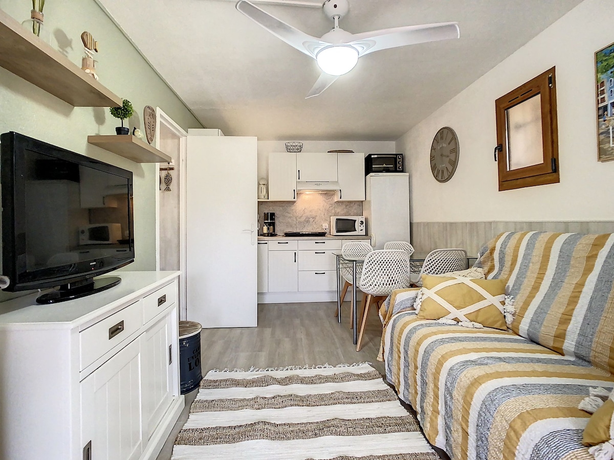 ¡Bienvenido a nuestro apartamento a los pies de la playa, ideal para unas vacaciones en familia! Apartamento con aire acondicionado y vistas al mar desde su terraza de 10 m2. Consta de un dormitorio separado con cama de matrimonio y armario. El salón dispone de sofá cama, TV con acceso a WiFi. La cocina está equipada con horno, lavavajillas, microondas, una gama SMEG. La terraza incluye una mesa y 6 sillones, así como una plancha. Conjunto residencial protegido, tranquilo y cerca de las tiendas locales.