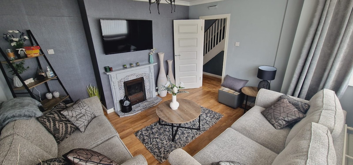 Casa luminosa y espaciosa de 3 dormitorios. Arriba tiene sala de estar con TV y canales gratuitos, además de dormitorio principal con baño en suite arriba. 2 dormitorios dobles más abajo, así como cocina/comedor, servicio y baño familiar. Todos los dormitorios y la cocina están equipados con tomas de carga USB. Duchas eléctricas en ambos baños. Aparcamiento en la calle adecuado para 2 coches. Zona pavimentada cerrada en la parte trasera y lateral de la casa con valla de 6 pies que también incluye tendedero. Zona de almacenamiento debajo de las escaleras.