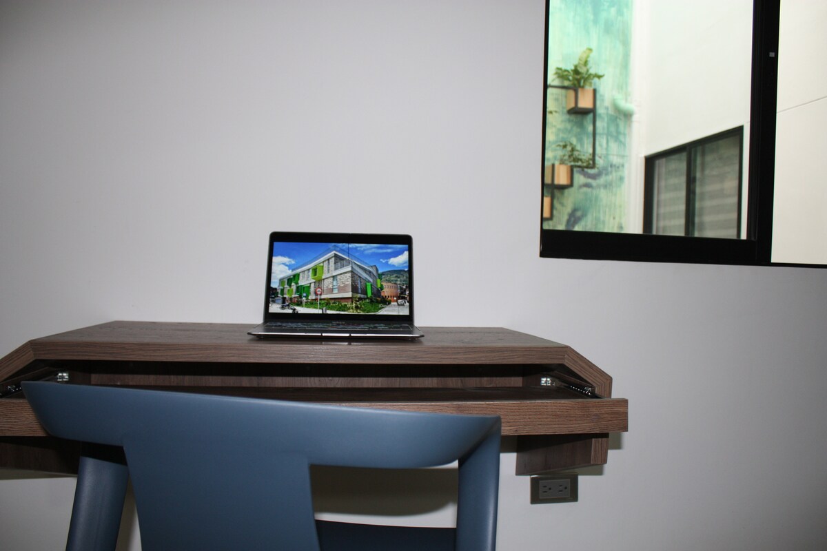 3450 Living is easy to spot among the trees in Laureles. Designed like the bow of a ship, the angular combination of glass, brick, black metal, and concrete is conveniently located. The relaxed atmosphere is perfect for young professionals, students, couples, digital nomads, or friends looking for a cost-effective space in a prime location. Four floors of modern-chic apartments feature expansive valley views from the balconies, residents also have access to the rooftop social area with jacuzzi.