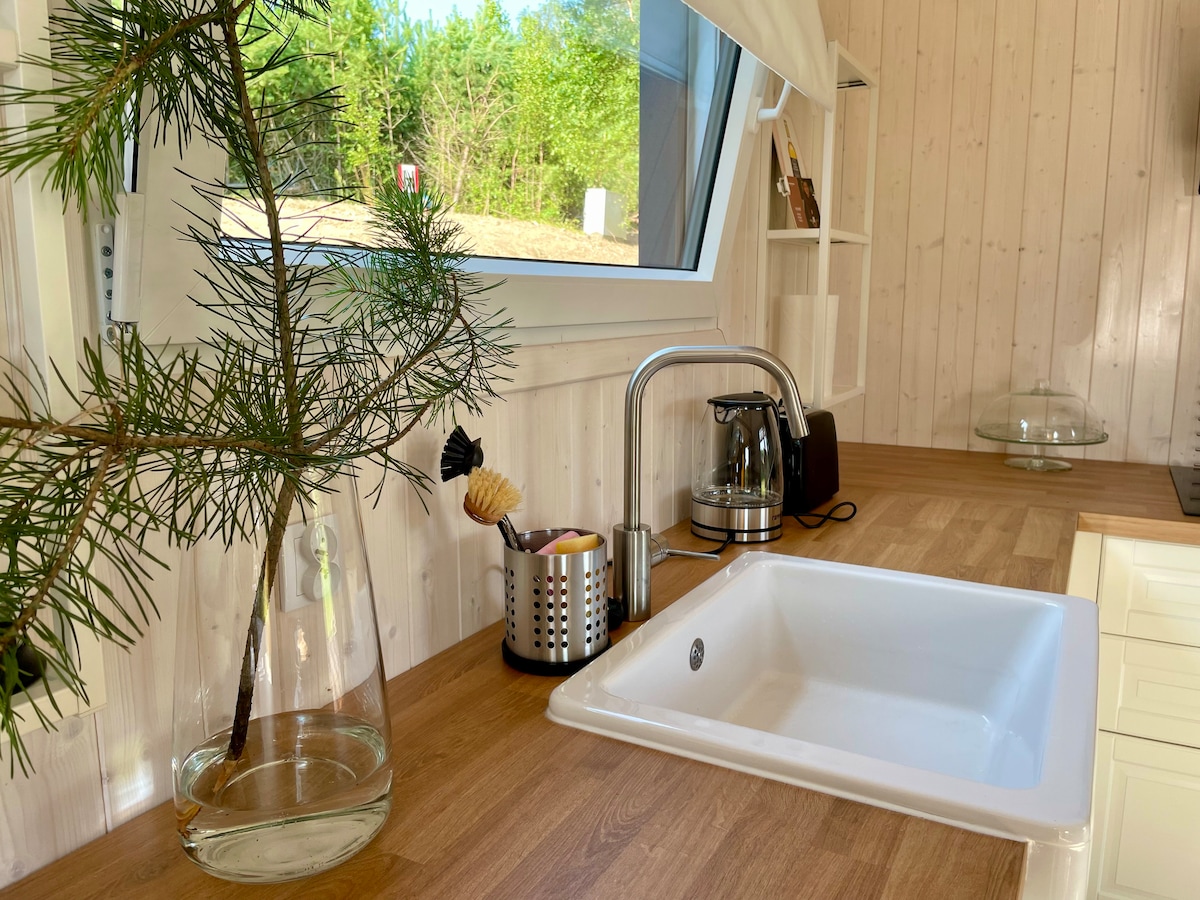 El precio de la estancia incluye acceso ilimitado al jacuzzi y a la sauna. Casa de campo Wabi Sabi para un máximo de 4 personas en el bosque junto a un lago en Casubia. Ofrecemos una casa de dos plantas de unos 45 m2 con dos dormitorios separados, una sala de estar común con zona de cocina, comedor, baño y una gran terraza rodeada de bosque. La parcela en la que se encuentra la casa tiene unos 500 m2 y está vallada. Además, en la gran terraza de madera tenemos un jacuzzi y una sauna solo para los huéspedes de la casa. Nuestra casa es para todo el año, tiene calefacción y una estufa. El lago Sudomie está a 150 m.