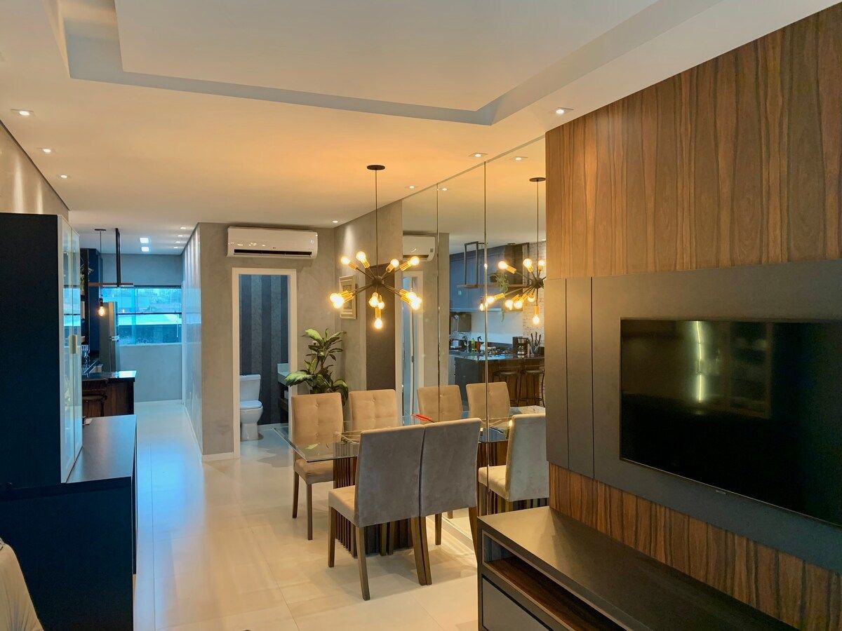 Departamento nuevo, completo y bien ubicado, con 3 dormitorios (1 suite + 2 trajes) y vida integrada con vistas a la playa de Brava, a solo 1 minuto a pie (50 m) de la playa. Ideal para familias y parejas que buscan comodidad, practicidad y encanto en la mejor región de Praia dos Amores: - Aire acondicionado, sala de estar y dormitorios. -1 cama tamaño queen, 1 cama doble y 2 individuales - Sala de estar inteligente de 50 pulgadas y habitaciones de 43 pulgadas. - Wifi. - Perrera completa. -Máquina lava e seca - Zona de barbacoa de carbón. - Ducha de gas Garaje de 2 asientos