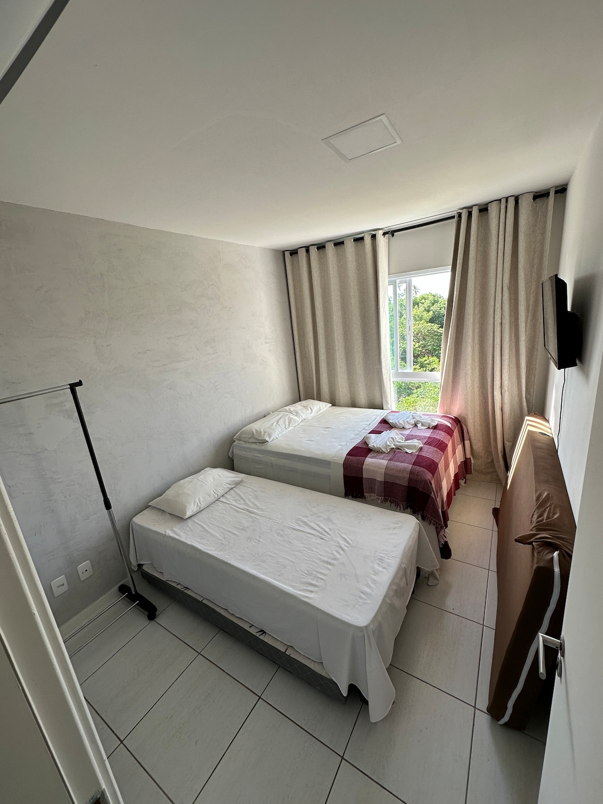 O apartamento é térreo, tem um quarto, com banheiro, água quente, TV a cabo, Wi-Fi, ar-condicionado split, forno microndas, cook top, frigobar, grill , air fryer, liquidificador, cafeteira, talheres e pratos, panela e frigideira. Acomoda, no máximo, quatro pessoas, tem uma cama de casal e uma bicama, limpeza e troca de lençóis diárias, se necessário. Checkin às 14h e checkout às 12h( poderá ser flexível, se estiver disponível, mas pode-se entrar no hotel antes das 14h).