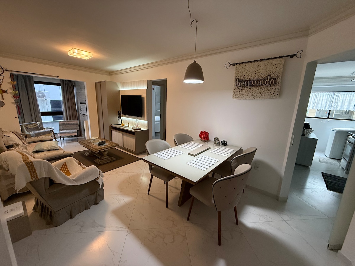 Apartamento completo para una estancia increíble, contiene balcón con parrilla, internet de fibra óptica, aire acondicionado frío/calor, cocina completa con electrodomésticos como horno eléctrico, microondas, licuadora, sandwichera y cafetera. Se pueden utilizar las áreas comunes del condominio, como piscina al aire libre y piscina climatizada, sala de juegos, sauna y gimnasio . El departamento está cerca del comercio local y a 450 metros de la playa de Bombas. 1 estacionamiento dentro del condominio.
