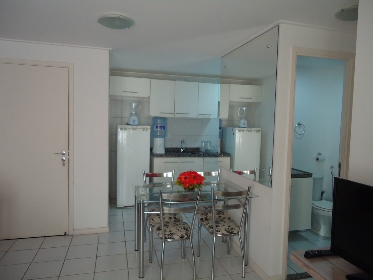 Apartamento con sala de estar con aire acondicionado split, balcón, 2 dormitorios (1 suite) los dormitorios con aire acondicionado split, baño social, comedor, cocina, lavandería con lavadora, se encuentra en el 3º piso, 3 ascensores totalmente amueblado con televisores inteligentes en la sala de estar y en la suite, sofá cama, wifi 250 mega, proporcionamos ropa de cama y toallas, dos plazas de aparcamiento. La zona de ocio con piscina, gimnasio, barbacoa se encuentra en la azotea con hermosas vistas al mar. La electricidad se cobra a 1,0 real por cada 1 kWh.