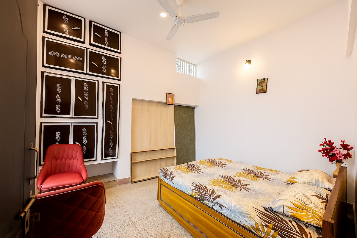 Welcome to our cozy guest room with its own private entrance, tucked away in a beautiful British-era bungalow right in the heart of the city. This is your oasis in the middle of the urban jungle—a perfect blend of tranquility and convenience. - Prime location: Centrally located, Railway station, Bus station, malls, and trendy cafes all within a 1 km radius. - Lush green lawns, perfect for morning coffee or an evening stroll. Pet-friendly! - Covered parking space. - Secured with CCTV coverage.