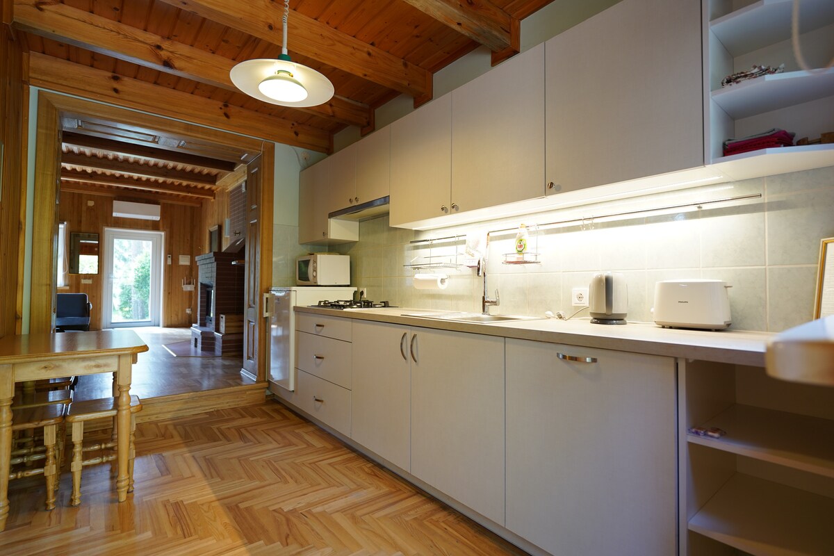 En julio de 2020 abrió sus puertas la recién renovada y elegante «Pamario namelis». El espacio de la casa se distribuye en dos plantas y está diseñado para 3 personas. En la planta baja encontrará una mini cocina, una sala de estar con un sofá cama de esquina (145x200) y un aseo. Desde la planta baja, unas cómodas escaleras conducen al dormitorio. Hay una cama doble (160x200) para un descanso cómodo. La luz que entra por la claraboya desde el sur le da al dormitorio una agradable sensación de luz y espacio. La casa tiene una terraza con muebles de jardín, solo para ti.