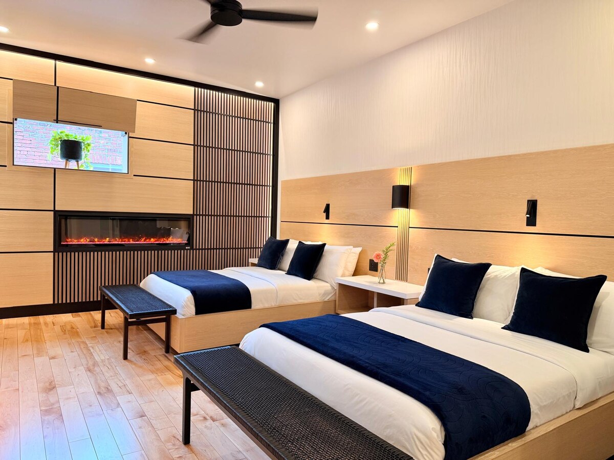 This 447 sq ft suite features two queen beds for group travellers or those who just want their own space. Suite 5 has a walk in shower with a large window to the bedroom (privacy blind), allowing maximum light to flow through, a separate water closet, radiant floor heating, ambient fireplace, work station, 75" smart tv, make-up station, and mini-bar. The bathroom area has a room dividing curtain for added privacy from the sleeping area.