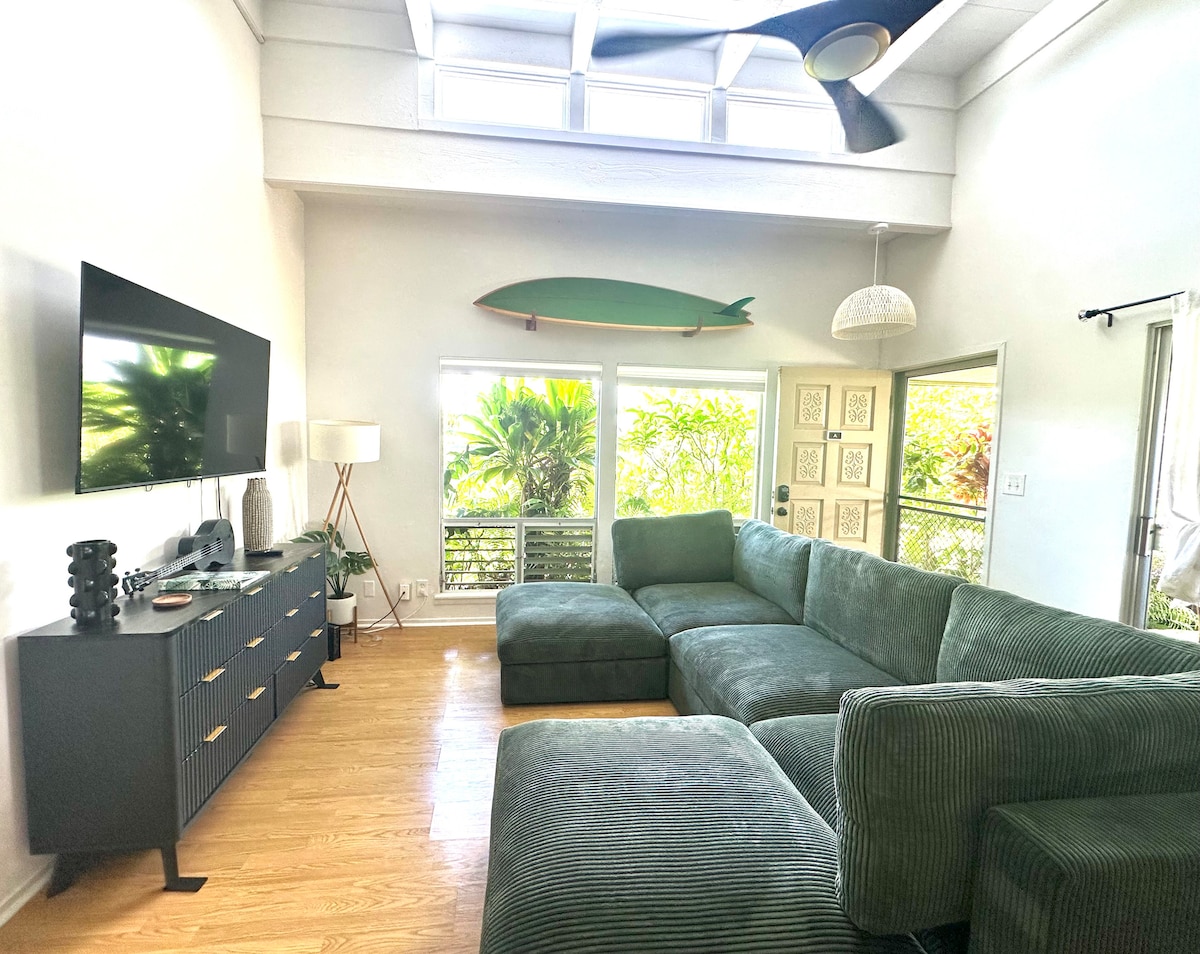 Hermosa unidad de tamaño estudio, con cocina americana, acceso combinado a lavadora/secadora y espacioso lanai en el corazón de Princeville. TOTALMENTE REMODELADO EN MARZO DE 2024 y reequipado con unidad de aire acondicionado, nuevo televisor inteligente, nevera/congelador, horno microondas/convección, cafetera Keurig, placa calefactora, hervidor eléctrico, licuadora y tostadora. Disfruta del uso de tablas de bodyboard, equipo de esnórquel y nevera para los días de playa. Tiene capacidad para 4 personas con cama tamaño king y sofá cama de tamaño completo. Piscina comunitaria/spa y barbacoas a solo unos pasos.