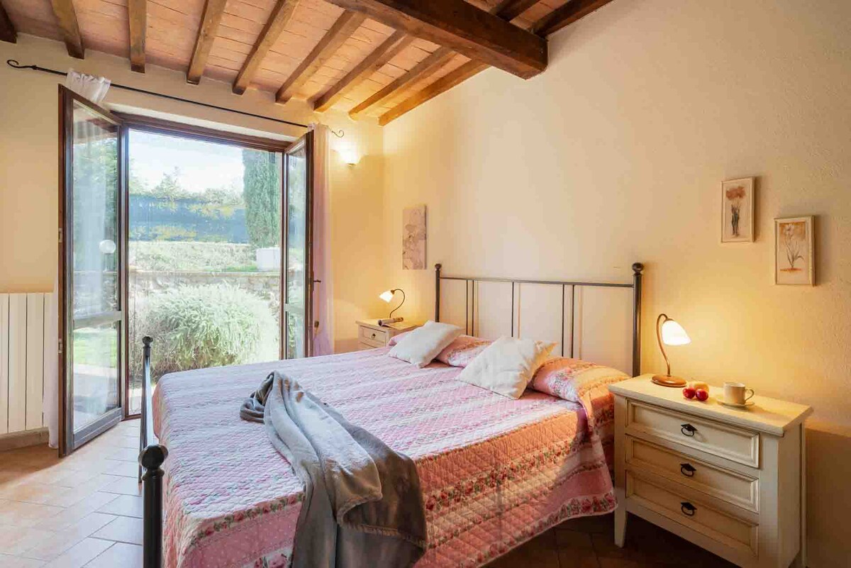El apartamento Rosmarino forma parte de la granja Le Chiuse, una propiedad de la década de 1840 inmersa en los viñedos. Consta de una sala de estar con cocina americana, sofá y chimenea con ventilador de techo, un dormitorio doble con aire acondicionado, un segundo dormitorio con dos camas individuales que se pueden convertir en una cama doble si es necesario, también con aire acondicionado, baño con ducha. Todas las ventanas están equipadas con persianas y mosquiteras. La apertura de la piscina es de temporada