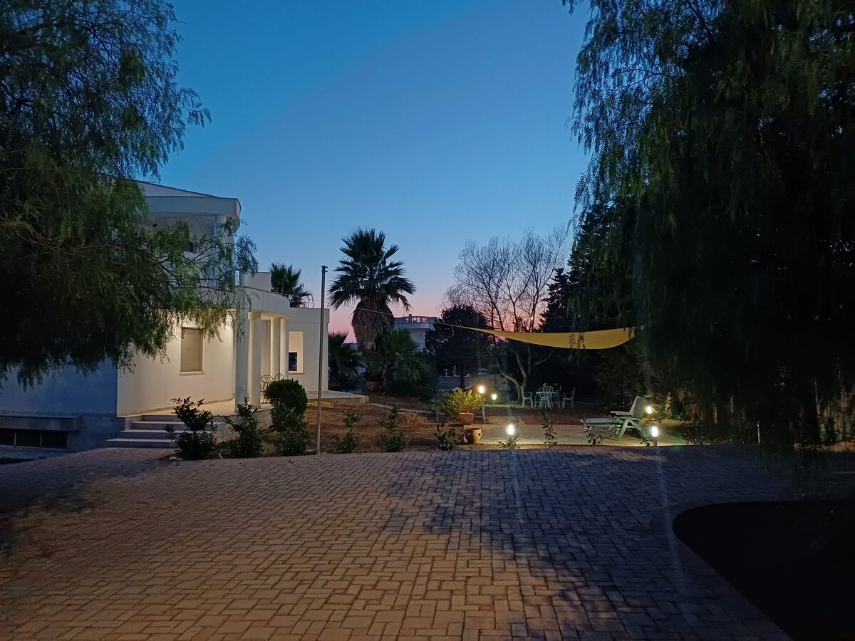 Cómodo y fresco apartamento de dos habitaciones con servicios en la planta baja de una villa con estacionamiento privado, olivar, gran jardín y bosque de pinos equipado para vivir y comer al aire libre. El apartamento está a unos 400 metros de la ciudad de Marina di Mancaversa y a 500 metros del mar. Uso gratuito del jardín, cocina al aire libre con horno y parrilla, hamacas, duchas al aire libre, lavandería. Posible uso de bicicletas. La casa es adecuada para una pareja o familia con niños.