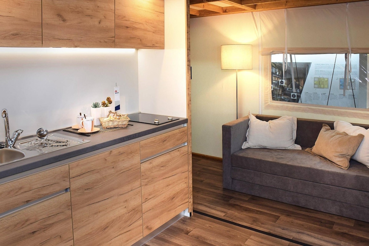 Nuestra tienda de campaña súper equipada te conquistará con su originalidad y su atmósfera mágica. Los muebles de madera sencillos y elegantes y los colores suaves y relajantes te harán sentir como si este lugar estuviera hecho a tu medida. Consta de dos dormitorios (uno con una cama doble y otro con una cama individual más una litera), sala de estar con cocina americana, baño privado con ducha y terraza de madera amueblada.