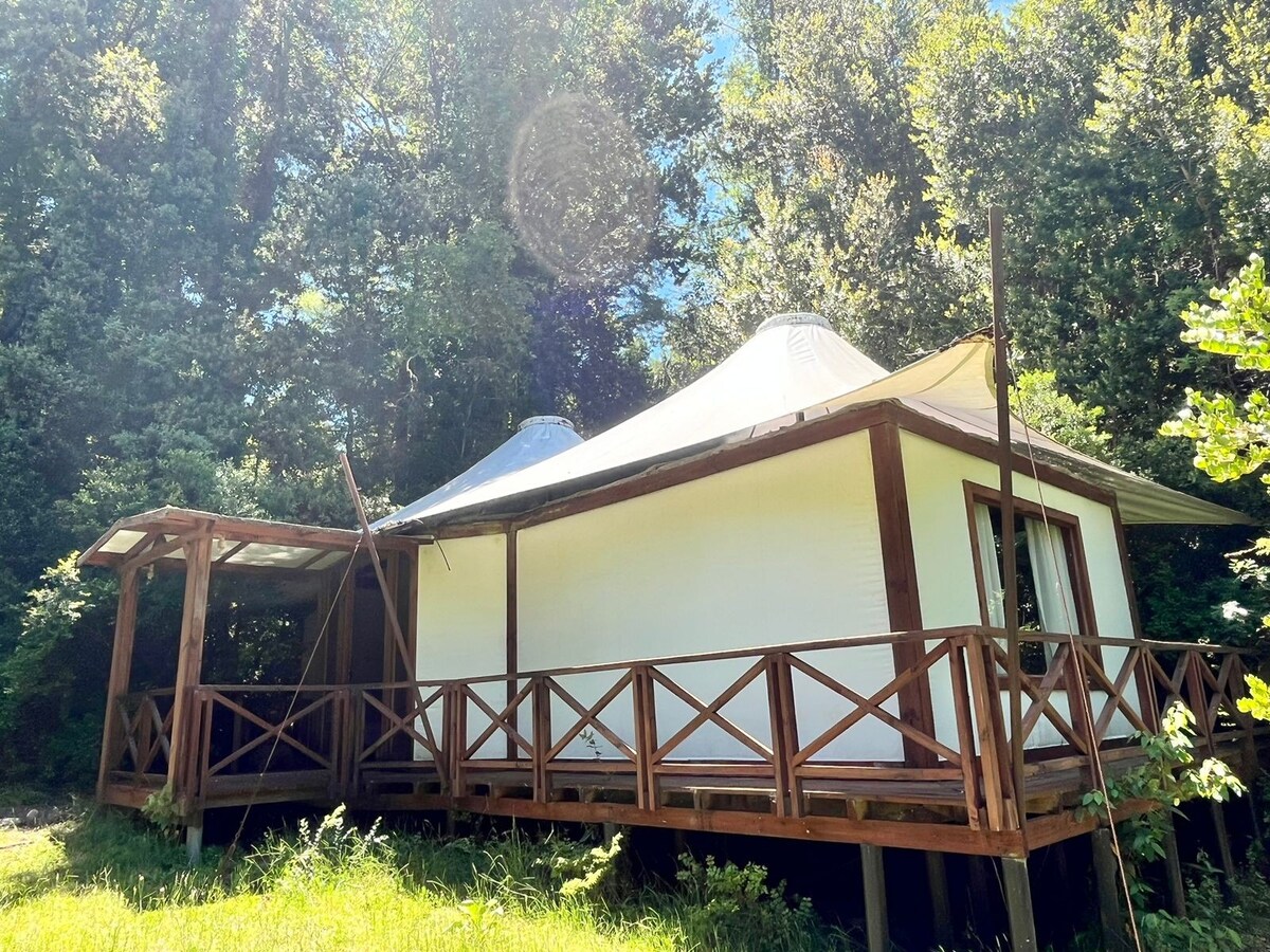 Desayuno de campo incluido. Inmersas en el bosque y abrazadas por dos ríos, nuestras carpas están equipadas con todo lo necesario para tu comodidad. A sólo 25 minutos de Pucón y en ruta a diferentes centros termales y parques nacionales como Huerquehue y El Cañi, disfrutarás de vistas espectaculares, el canto de las aves y el arrullo del río Liucura. Ofrecemos una cama muy confortable, calefacción y baño privado, además de un cobertizo y un espacio para hacer fuego y compartir.