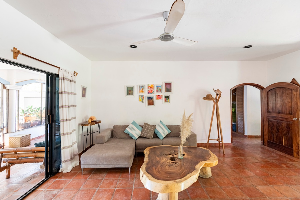 Depa amplio y luminoso en planta alta con 2 camas queen súper cómodas, A/C en la recámara y ventiladores en sala y cocina. Cuenta con cocina equipada, salita acogedora y balcón con vista a palmeras. Estás a solo 2 min de la playa y a 1 min de cafés, tiendas y restaurantes. Disfruta el patio compartido con hamacas, árboles frutales, asador y área de pesas artesanales. Ideal para relajarte, surfear o trabajar remoto con buena vibra.