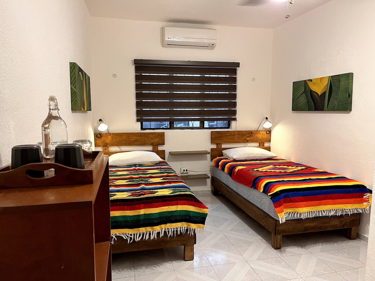 Confortable casa de huéspedes no muy lejos del centro, ubicada en una posicion acessible. Perfecto para quien tiene auto o quiere moverse con los transportes o bicicleta. El jardin con plantas tropicales es de 500 mq con una alberca, compartida con mi casa, dotada de jacuzzi con burbujas de 6x4 mt. La casa en estilo rustico mexicano cuenta con amenidades modernas. El ambiente es de tipo familiar y friendly.
