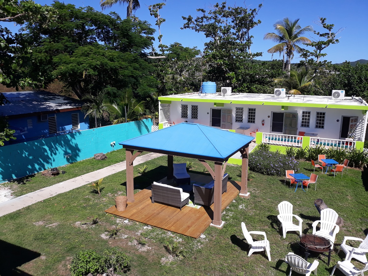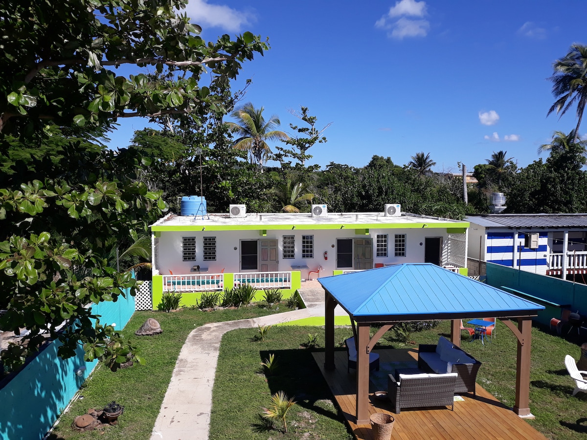 Somos una propiedad divertida y caribeña en la playa llena de colores tropicales, con una excelente ubicación y mucha buena comida. Nuestras habitaciones tienen que ver con una ubicación económica ,el lugar ideal para alojarte si buscas caminar hasta la playa, los restaurantes locales, la música y el ambiente de la isla, el punto de partida para los recorridos a la bahía bioluminiscente, a poca distancia de la playa Sunbay. Simple, pequeño, lindo, limpio. Queremos que aprecies y ames nuestro lugar e isla tanto como nosotros, con ganas de volver y visitarnos de nuevo.