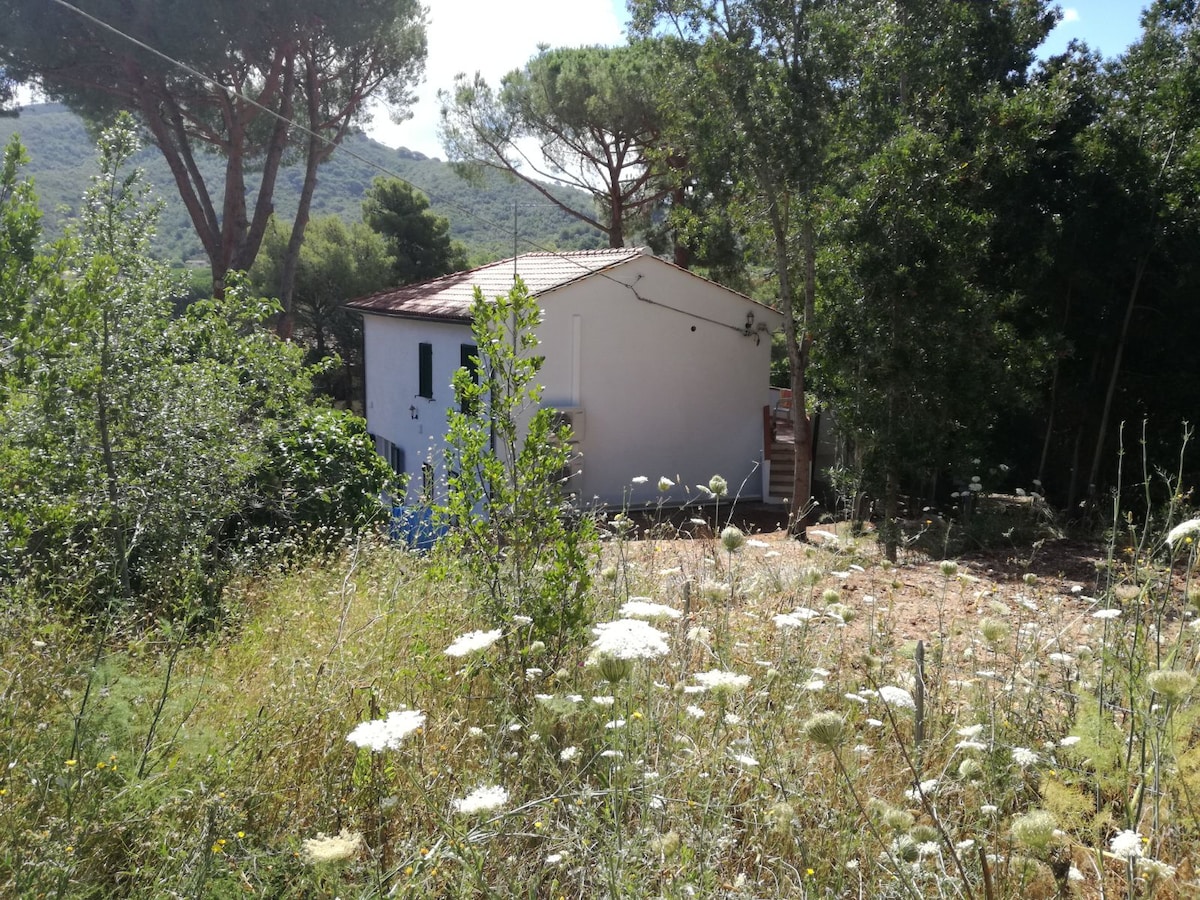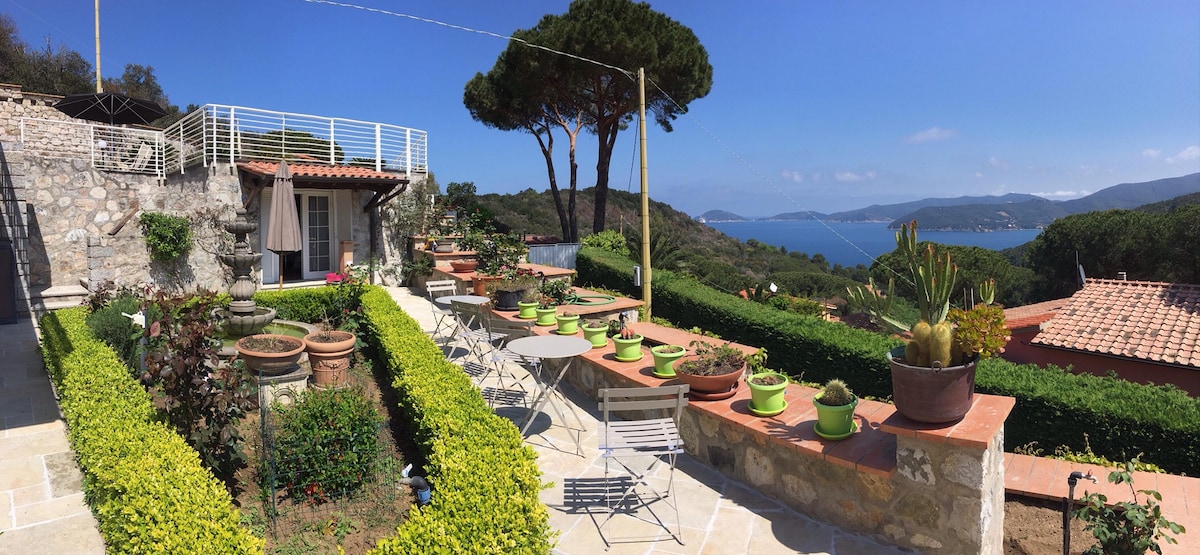 Delizioso appartamento arredato con cura, in stile etnico, provvisto di ogni comfort, in un casolare appena ristrutturato secondo i principi della bioedilizia, immerso nella macchia mediterranea del più bel versante dell'isola d'Elba, con vista mozzafiato sull'arcipelago toscano e sulla Corsica, a 250 m sul livello del mare, dominante la spiaggia di Cavoli. L'appartamento è composto di soggiorno con angolo cottura e divano-letto per due persone, camera matrimoniale e bagno con doccia e ampio spazio esterno attrezzato per pranzare e prendere il sole. Il luogo è raggiungibile con una strada sterrata di 2,5 km dal paesino di San Piero in Campo (fin dove arrivano i mezzi pubblici), distante pochi minuti di macchina dalle spiagge più incantevoli dell'isola (Cavoli, Seccheto, Fetovaia) e dal centro turistico e commerciale di Marina di Campo. E' consigliabile disporre di un mezzo proprio. La casa è immersa nella tipica macchia mediterranea alternata a grandi e suggestive scogliere di granito. Il grande giardino è recintato, contiene un orto e un uliveto. Non vi sono altre abitazioni nei dintorni. Intorno alla località si snodano i più suggestivi sentieri per gli amanti del trekking e della mountain bike. Ideale per chi è in cerca di silenzio, relax, aria pura, e ama la natura e i luoghi un pò speciali. I padroni di casa potranno aiutarvi per ogni evenienza e perplessità. BREATHTAKING VIEW ON THE ARCHIPELAGO Charming apartment,furnished in ethnic style,with every comfort,in an old cottage just renovated according to the bioarchitecture,amidst the Mediterranean bush in the most beautiful part of Elba island with breathtaking views on the Tuscan archipelago and (email hidden) a.s.l.,overlooking famous Cavoli beach. The apartment has a living room with kitchenette and divan bed for two persons,a double bedroom and a bathroom with shower and a large outside patio for eating and sunbathing. You can reach the place through a 2,5 Km dirt road from San Piero in Campo,where pubblic transport ends,and from where ,in few minutes by car you can get to the best beaches of the island (Cavoli,Seccheto,Fetovaia etc.),and to the touristic and service centre of Marina di Campo. It's better to have your own car or motorbike(you can rent it anywhere on the island). The house is surrounded by the typical mediterranean bush scattered with huge granite cliffs. The large garden has an olive grove and a vegetable garden. The place is secluded and there are no other houses in the surroundings. It's an ideal place for trekking and mountain biking and lovers of relax,peace,nature and special places. Your host are ready to help for any need and request.