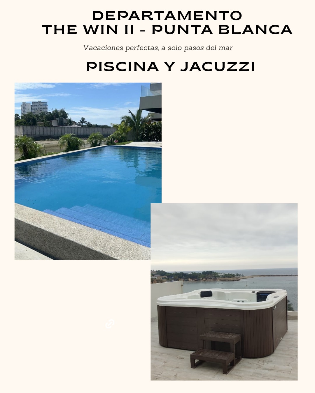 Elegante Suite detrás del Hotel Barceló, a 150 m del Mar, zona residencial, a 100 metros de prestigioso patio de comidas de Salinas, cuenta con una excelente vista y con áreas múltiples para poder disfrutar de un ambiente acogedor relajado y seguro. Cuenta con Piscina, jacuzzi, gimnasio y salón social.