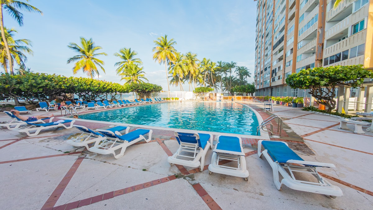 Un apt studio frente a la playa en Condado. Cama queen y sofa futon, ideal para 2 personas. Tiene internet, TV con cable, lavadora y secadora, cortinas para oscuridad, cocina, sillas de playa. Incluye 1 estacionamiento, el condominio es viejo y esta en reparaciones pero tiene una piscina olímpica con sillas de playa, piscina de niños, area de BBQ, cancha de tenis, gimnasio y seguridad 24/7. Accesible a tiendas, supermercados, farmacia, restaurantes, hospital y 15 mins en carro al aeropuerto.