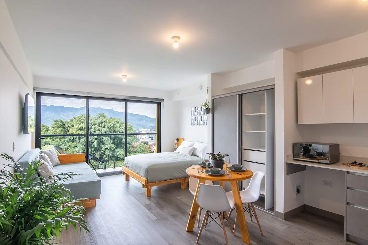 Estudio con cama tamaño queen y vistas al atardecer + jacuzzi