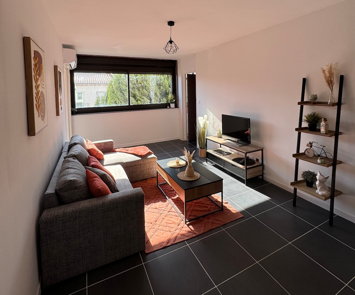 Appartement cosy à Perpignan dans un quartier calme. Détendez-vous dans la grande baignoire luminothérapie avec des lumières d'ambiance, possibilité de connecter de la musique via Bluetooth. Surface de 40 m² avec extérieur et terrasse d'été. Entièrement rénové, équipé de climatisation réversible pour votre confort été comme hiver. Logement non Accessible au PMR.