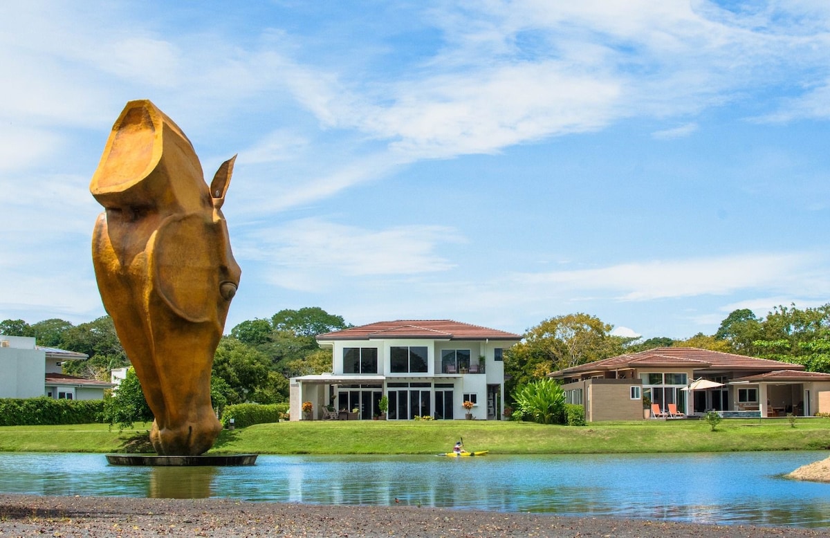 Alistese para una estadía llena de relajación y lujo. Seguridad y belleza natural, rodeada de lagos donde lo lujoso y la naturaleza se funden en mas 865 acres de un santuario de vida silvestre donde la naturaleza y el ser humano coexisten. Acceso a la playa para la recreación , deporte al aire libre, pesca, kayaking, etc.. Destino top para la practica de surf y con suerte reciba visitas de lapas y otras aves exóticas.. El pura vida y este paraíso tropical lo esperan en una casa lujosa y moderna.