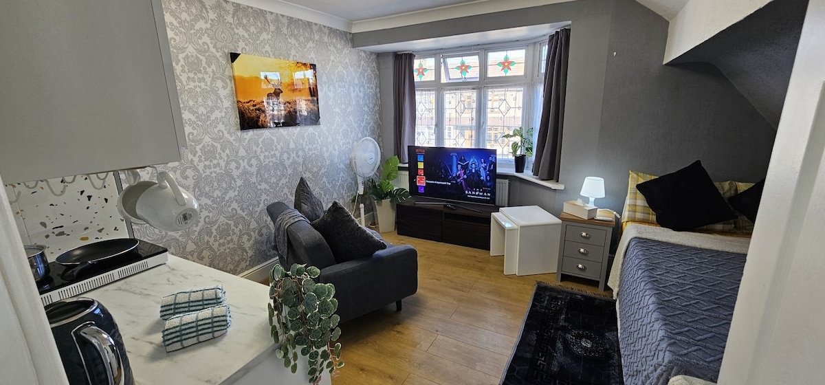 Nos gustaría darte la bienvenida a este pequeño estudio moderno y acogedor renovado, con una cocina funcional, ducha, área de almacenamiento y dormitorio a solo 5 minutos de todo lo que puedas necesitar. Una zona tranquila y cómoda donde puedes visitar pubs, 2 centros comerciales, parques, un museo, deliciosos restaurantes, mercados diurnos y mucho más. La estación de tren está a 15 minutos y puede llevarte directamente al centro de Londres.