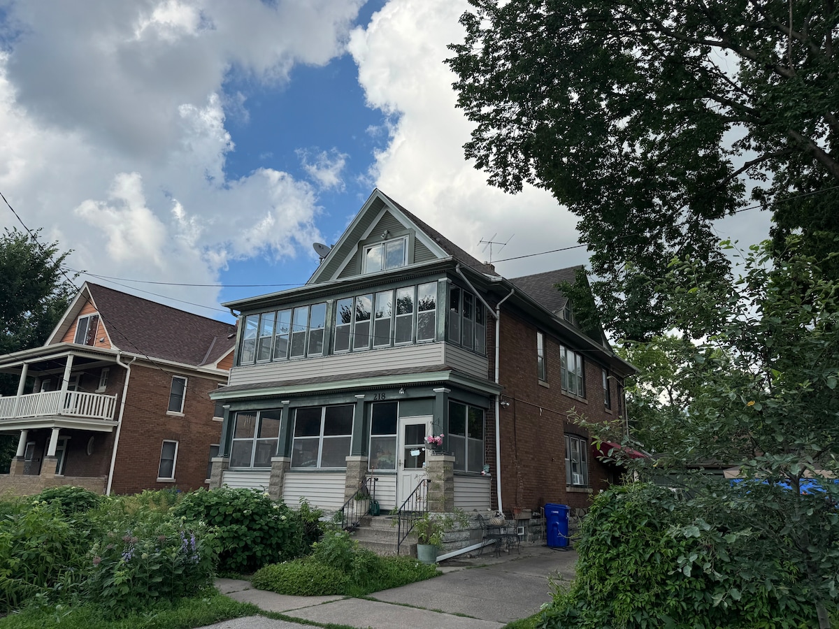 Segundo piso privado de un encantador dúplex en el histórico barrio de Union Park. Dormitorio queen, sala de estar con cama doble, cocina, armarios enormes, balcón. Aparcamiento en la calle, sauna, lavandería. Fácil acceso a pie a Macalester College, Whole Foods. A seis manzanas a pie de Allianz Field, a 1,5 millas de St. Thomas, Hamline, St. Cate's, Concordia. A 15 minutos del aeropuerto MSP. Amelia Earhart vivió aquí según la leyenda del barrio.