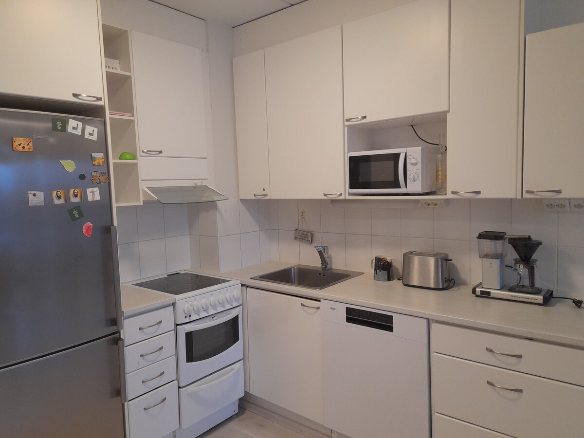 • Luminoso apartamento de 52 metros cuadrados de 2 habitaciones en el distrito más moderno y agradable de Helsinki, Kallio, a 2 km del centro de la ciudad. • Seguro que apreciarás la práctica ubicación cerca de la estación de metro, muchas líneas de tranvía y la ruta del autobús del aeropuerto. • Equipado con una cama tamaño queen muy cómoda que seguramente te encantará + sofá cama opcional y silla cama para huéspedes adicionales. • Cocina recién renovada y bien equipada con lavavajillas, lavadora, etc. • Disfruta de nuestras cuentas de Netflix y Disney+.