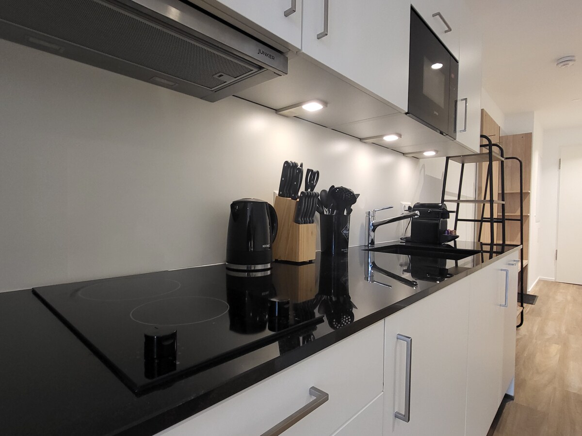 El apartamento estudio amueblado de 35 metros cuadrados de alta calidad ofrece baño, sala de estar, cocina y terraza. Puedes comenzar el día con un delicioso café NESPRESSO y disfrutar de todas las hermosas comodidades de este apartamento. El departamento cuenta con un acogedor TAMAÑO QUEEN Cama matrimonial de somier y a través de un sofá cama(extensible a 1,40 x 2) Metros). En la sala de estar encontrarás un comedor para 3 personas, así como un gran televisor inteligente de 40 pulgadas.