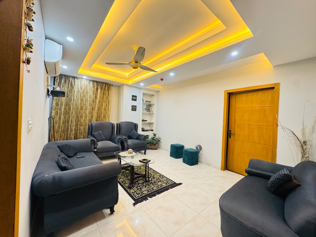 Bienvenido a nuestras elegantes suites de dos dormitorios en DHA 5 Islamabad. Disfruta de la comodidad de un viaje rápido y relájate en un espacio con una decoración encantadora y un cine en casa totalmente equipado. Ideal para viajeros que buscan comodidad y entretenimiento, este acogedor refugio ofrece comodidades modernas en una ubicación privilegiada. Es una porción completamente separada con su propia entrada y aparcamiento separados, apta para familias, por lo tanto, muy segura y tranquila. No se permiten fiestas ni música alta. No se admiten parejas solteras