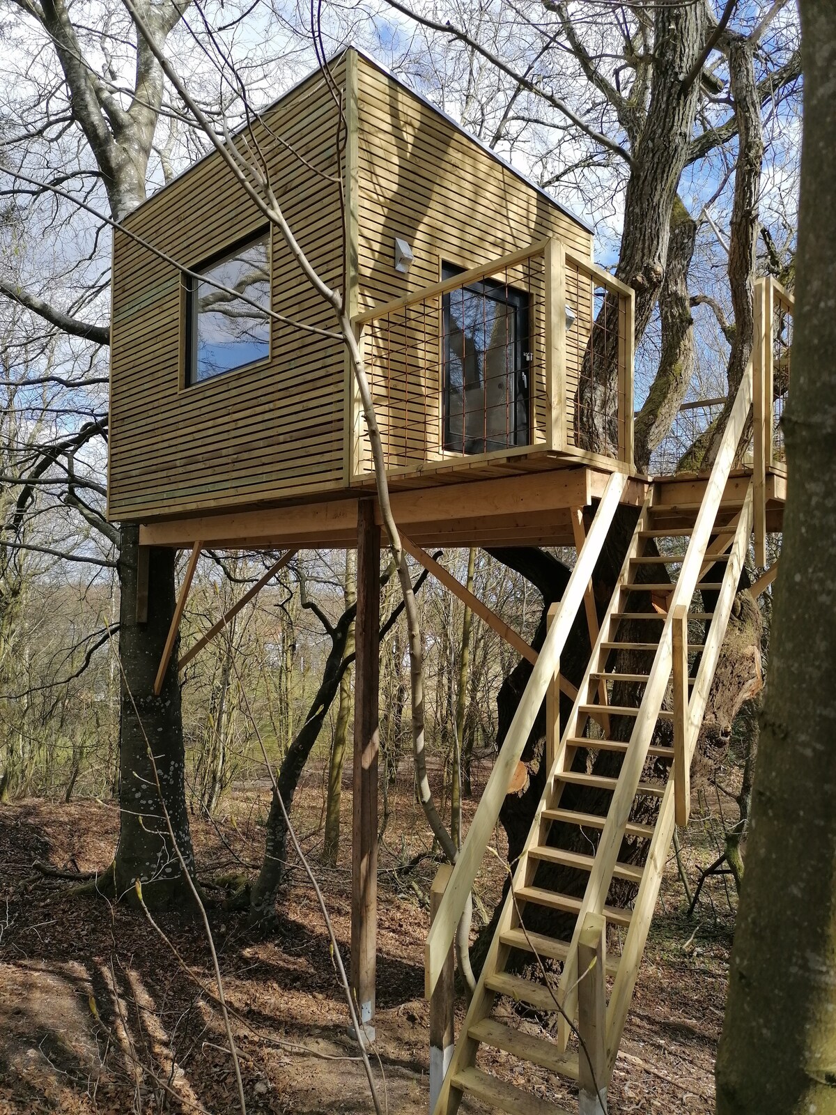 Tæt på byen ligger et træhus gemt inde midt i en skov. Det lyder ligeså fantastisk som det er. Her får I rå natur, ro og skov, uanset hvor I kigger hen. Huset er veludstyret, værelserne hyggelige og terrassen perfekt til morgenkaffen, frokost i det fri, grillhygge eller ligge på en solseng og læse bog. Gå i lysningen og tænd et bål eller hop på trampolin med børnene. I huset finder I køkken, wc og bad og en hyggelig stue med brændeovn. Spil brætspil eller stream en film. Bare slap af her.
