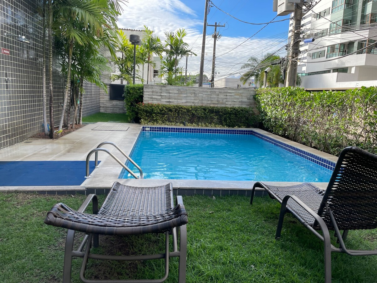 Edificio tipo Home Club con Recepción 24h, garaje para 01 coche mediano, piscinas para adultos/niños, gimnasio, lavandería en el edificio (con costo), a 300 metros de la playa de Boa Viagem y a 5 minutos en coche del aeropuerto. Cerca de panadería, supermercados, restaurantes, bares, pizzerías, farmacias, salón de belleza y Parque Dona Lindu (frente al mar). Se puede acceder a pie a la plaza de Boa Viagem (feria de artesanía) (15 min). El baño de mar en las piscinas naturales es posible durante la marea baja (10 min a pie).