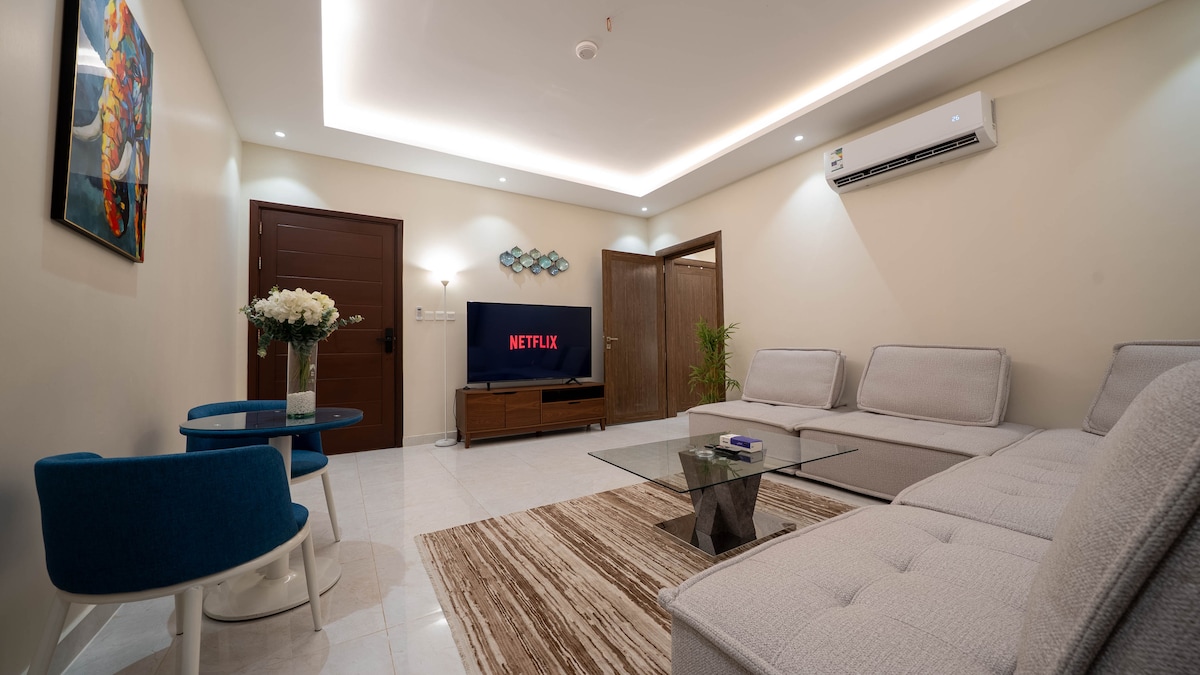 Descubre Lusso Suites: elegantes, inteligentes y lujosas. Disfruta de un dormitorio principal, una elegante sala de estar, una cocina completa y un televisor inteligente de 75 pulgadas con todas las aplicaciones. Ubicación privilegiada en Yeda, en Prince Sultan Road, rodeada de restaurantes, cafeterías y supermercados. A solo 4 minutos del aeropuerto, a 3 minutos del Arab Mall, a 4 minutos de la Corniche. Está prohibido❌ fumar y fumar shisha.