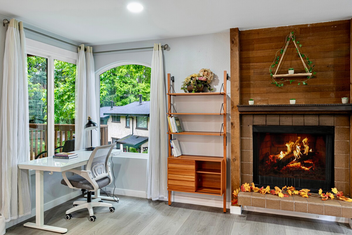 Casa de campo moderna en el lago Sammamish: 2 dormitorios / 2 baños con aire acondicionado y chimenea de gas. Ambos dormitorios cuentan con lujosos edredones y almohadas. Disfruta de suelos de madera, una cocina bien equipada con electrodomésticos nuevos, lavadora/secadora, comedor para 6 personas, un sofá cama, TV de 55" y cafetería. Relájate con una cena con vistas al lago, haz kayak por la costa o explora el sendero del lago Sammamish justo al lado de tu puerta. ¡Los perros bien educados son bienvenidos!