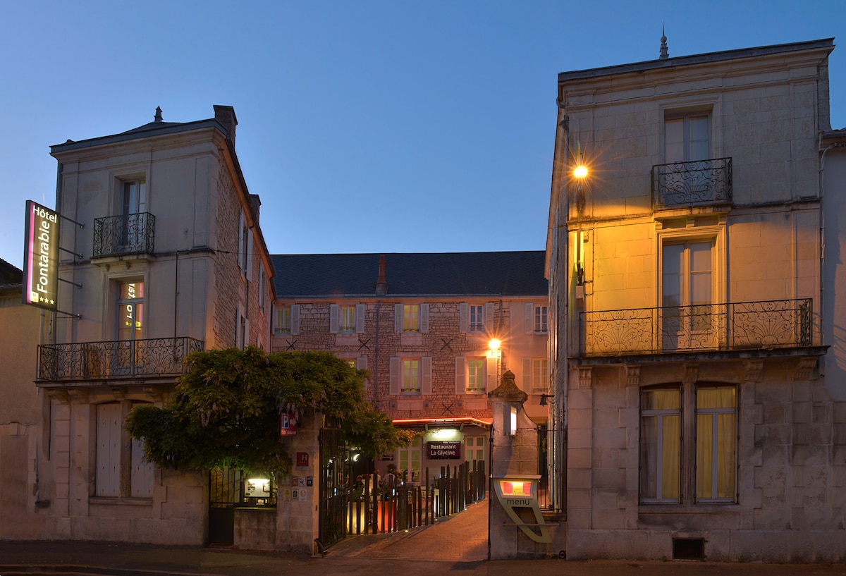 Bienvenue au Fontarabie-Restaurant La Glycine. Une équipe chaleureuse vous accueille pour un moment de détente dans l'une de nos 49 chambres tout confort. Au cœur du centre ville de Fontenay le Comte, ville d'art et d'histoire, vous êtes à 2 pas : du Marais Poitevin, des Abbayes du Sud Vendée, de la foret de Mervent et ses Petites cités de caractère... Idéal après une bonne journée, prenez le temps d'un diner où produits frais et locaux se mêlent pour le plaisir des yeux et des papilles.