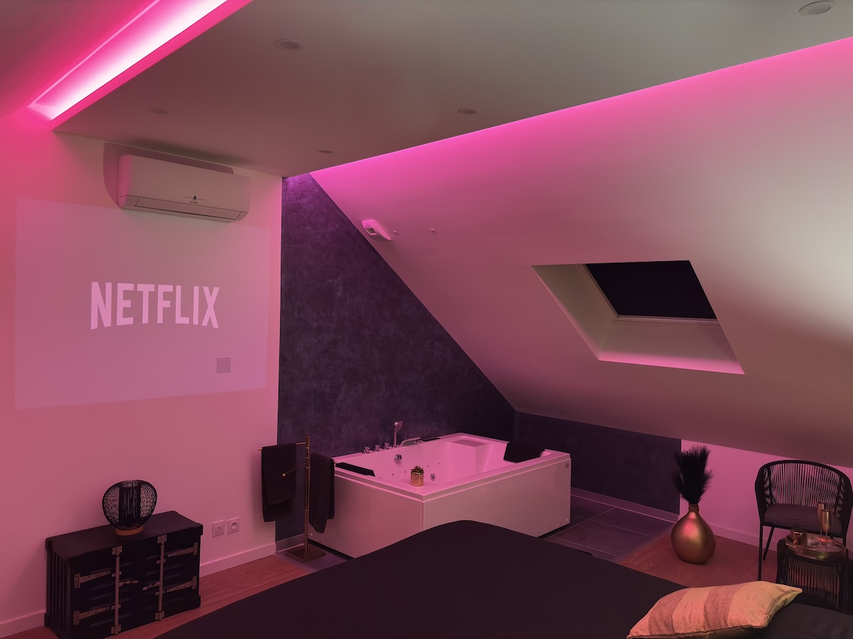 Situé dans le charmant petit village d’Altviller, venez vous relaxer à deux, dans notre logement de 65m2 zen et cosy, calme et entièrement privatif, avec CUISINE ÉQUIPÉE, GRAND JACUZZI haut de gamme : 136 jets chromothérapie, 6 places avec cascade, enceinte connectée et COIN SALON avec CHEMINÉE ÉLECTRIQUE et TV, une SALLE CINÉMA 4K Full HD Dolbystéréo 5.1 avec FAUTEUILS RELAX MASSANTS et clé Amazon pour connecter vos abonnements Netflix… BORNE JEUX ARCADE, WIFI et TERRASSE extérieure aménagée.