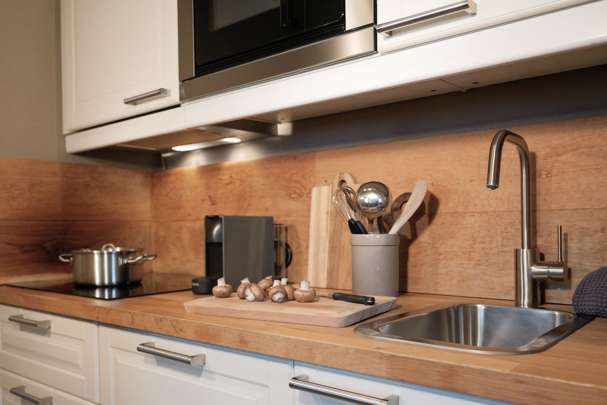 Pequeño apartamento de 23 m² | estilo rústico moderno | salón-dormitorio | jardín privado | baño moderno | cocina americana bien equipada | cafetera Nespresso con cápsulas orgánicas | ubicación tranquila | aparcamiento en la puerta | ocupación: dos adultos o una familia con uno o dos niños pequeños