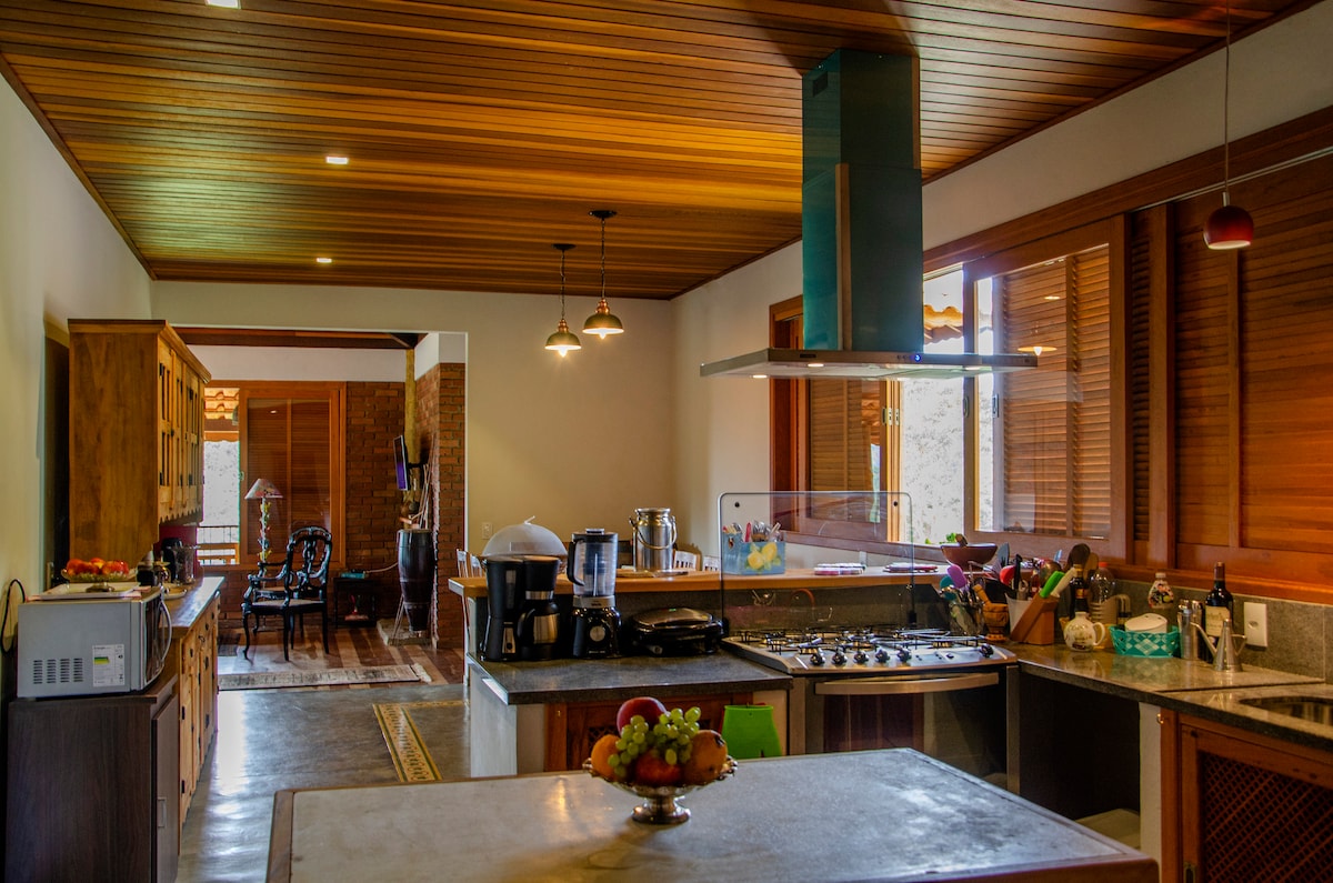 🏡 Casa do Córrego – onde natureza, conforto e história se encontram • Acomoda até 10 hóspedes • 3 quartos confortáveis (1 suíte) • 1 cama king, 2 camas queens e 1 cama casal • 2 banheiros completos • Cozinha equipada (fogão, geladeira, micro-ondas, air fryer, cafeteira normal e Nexpresso, etc.) • Sala com lareira e janelões para a mata • Wi-Fi de fibra (o melhor disponível na região) • Jacuzzi aquecida ao ar livre • Churrasqueira, redário e área externa privativa