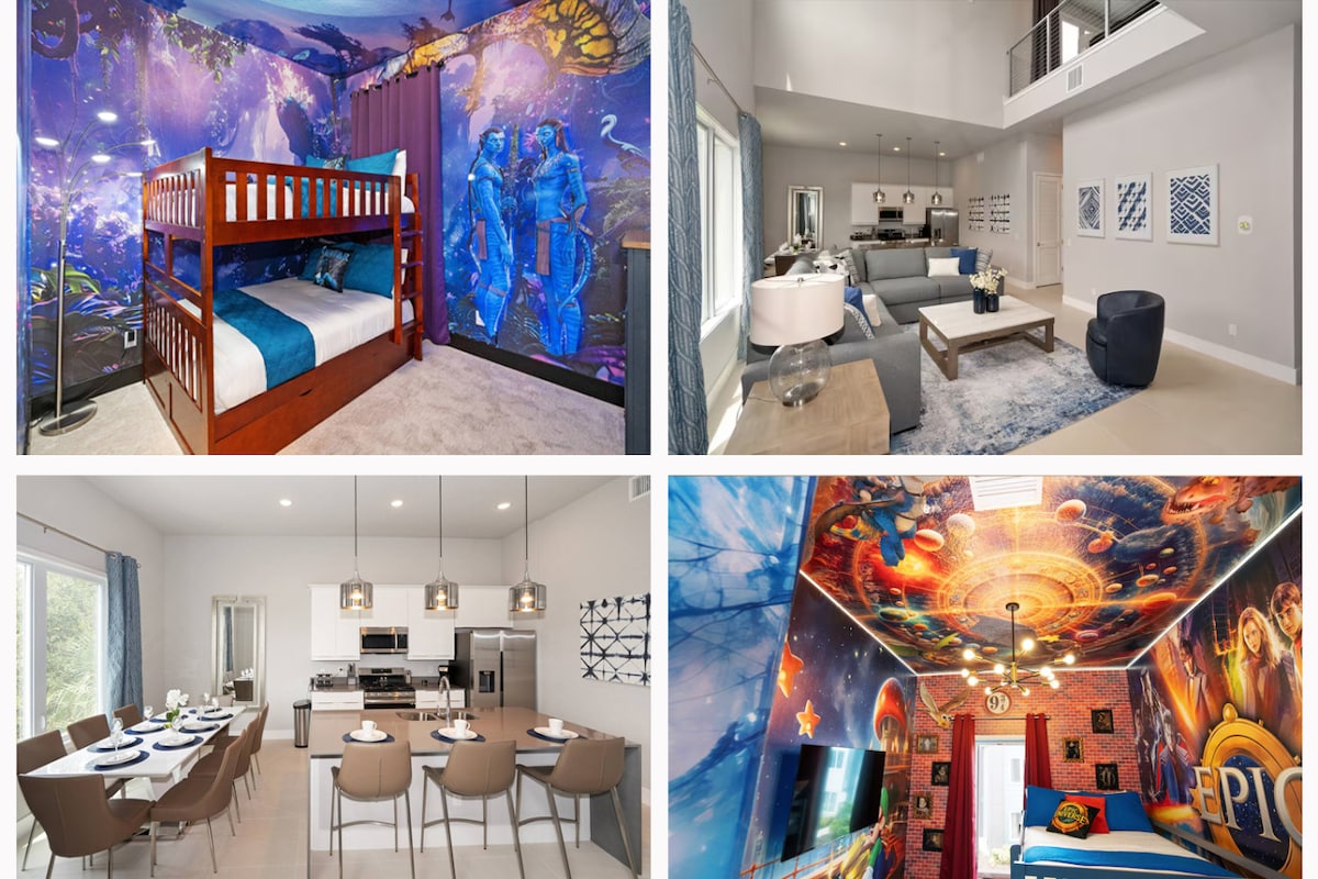 Perfecta para familias y escapadas en grupo, esta espaciosa villa temática de 5 dormitorios y 5 baños en Reunion Village está a solo 21 minutos en auto de Disney y tiene capacidad para 14 huéspedes. Disfruta de una piscina privada y un garaje convertido en cine en casa, habitaciones temáticas para niños y elegantes espacios abiertos. Ubicado a minutos de Disney, tiendas y restaurantes, con acceso a las piscinas y servicios selectos de la comunidad Reunion Resort, este alojamiento combina comodidad, diversión y conveniencia para una estadía inolvidable en Orlando.