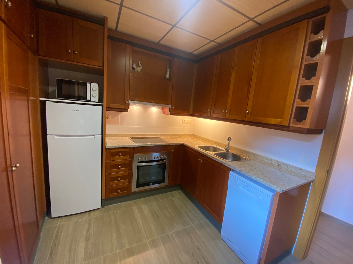 Este apartamento es tranquilo. Todo exterior. Consta de salón/comedor con cocina americana, balcón con vistas , sofá, smart TV. La cocina viene equipada con nevera, lavadora, microondas, vitrocerámica, utensilios para cocinar, cafetera Nespresso y tradicional. El baño es completo. Dispone de dos habitaciones, una con cama de matrimonio y que tiene un pequeño balcón exterior y la segunda con dos camas individuales. (Disponemos de apartamento en planta inferior ver otro anuncio en Roní)