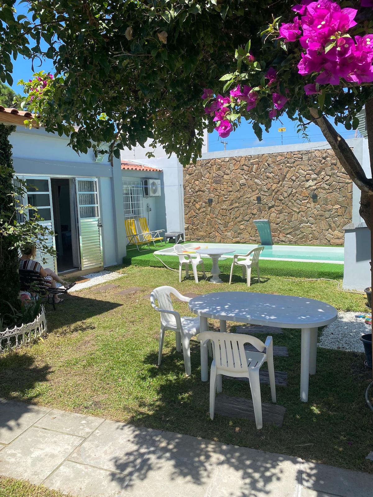 Relájese con su familia en una casa cómoda con un gran patio cerca de la playa. La casa cuenta con una cama de matrimonio queen, dos camas individuales y un sofá cama de matrimonio, todos los utensilios domésticos, parrilla en el exterior, dos bicicletas, ventiladores de techo en todas las habitaciones, aire acondicionado en la habitación de matrimonio, red Wi-Fi, ducha 220, red bifásica 110/220, smart TV con varios canales, sistema de alarma, rejas en todas las aberturas, a dos cuadras de la playa en un lugar tranquilo.